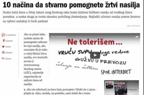 | AWC has prepared a press release in which it welcomed the adoption of the new Law on Prevention of Domestic Violence, noting that it advocated for the most important changes years before, and that only the application of the Law can be a measure of its validity. Parts of the press release were quoted from a journalist of the daily newspaper Politika. Magazine Lepota i zdravlje has set up a call for participation in the campaign, also stated in the editorial of the chief editor. Print advertisement was published by the magazine Nedeljnik, with a text in which they used quotations from the AWC activists on this subject. The text which was prepared by the AWC on 10 ways to help victims of domestic violence (concrete advices) was a useful read for the internet public and got published on 9 portals and blogs: Nedeljnik, Blic Zena, PortalMladi, Bgonline, iSerbia Glas mladih, Savrsena, CMV, Sitoireseto, Milos Djajic. It should be noted that the campaign #NeTolerisem was implemented in the same period when the state led three campaigns on the same subject: one led by the Ministry of Justice ("Iskljuci nasilje"), and two other by the Coordinating Body for Gender Equality in cooperation with the UNDP ( "Da ne bude kasno") and UN Women (installation "orange SOS phone "), which created the effect of media saturation. Within the campaign, we have also organized #NeTolerisem posters at 25 locations in the city. Although it is difficult to assess the reach of the campaign message, the number of citizents who saw it is no less than 1.5 million. |