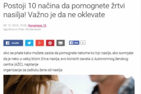 | AWC has prepared a press release in which it welcomed the adoption of the new Law on Prevention of Domestic Violence, noting that it advocated for the most important changes years before, and that only the application of the Law can be a measure of its validity. Parts of the press release were quoted from a journalist of the daily newspaper Politika. Magazine Lepota i zdravlje has set up a call for participation in the campaign, also stated in the editorial of the chief editor. Print advertisement was published by the magazine Nedeljnik, with a text in which they used quotations from the AWC activists on this subject. The text which was prepared by the AWC on 10 ways to help victims of domestic violence (concrete advices) was a useful read for the internet public and got published on 9 portals and blogs: Nedeljnik, Blic Zena, PortalMladi, Bgonline, iSerbia Glas mladih, Savrsena, CMV, Sitoireseto, Milos Djajic. It should be noted that the campaign #NeTolerisem was implemented in the same period when the state led three campaigns on the same subject: one led by the Ministry of Justice ("Iskljuci nasilje"), and two other by the Coordinating Body for Gender Equality in cooperation with the UNDP ( "Da ne bude kasno") and UN Women (installation "orange SOS phone "), which created the effect of media saturation. Within the campaign, we have also organized #NeTolerisem posters at 25 locations in the city. Although it is difficult to assess the reach of the campaign message, the number of citizents who saw it is no less than 1.5 million. |