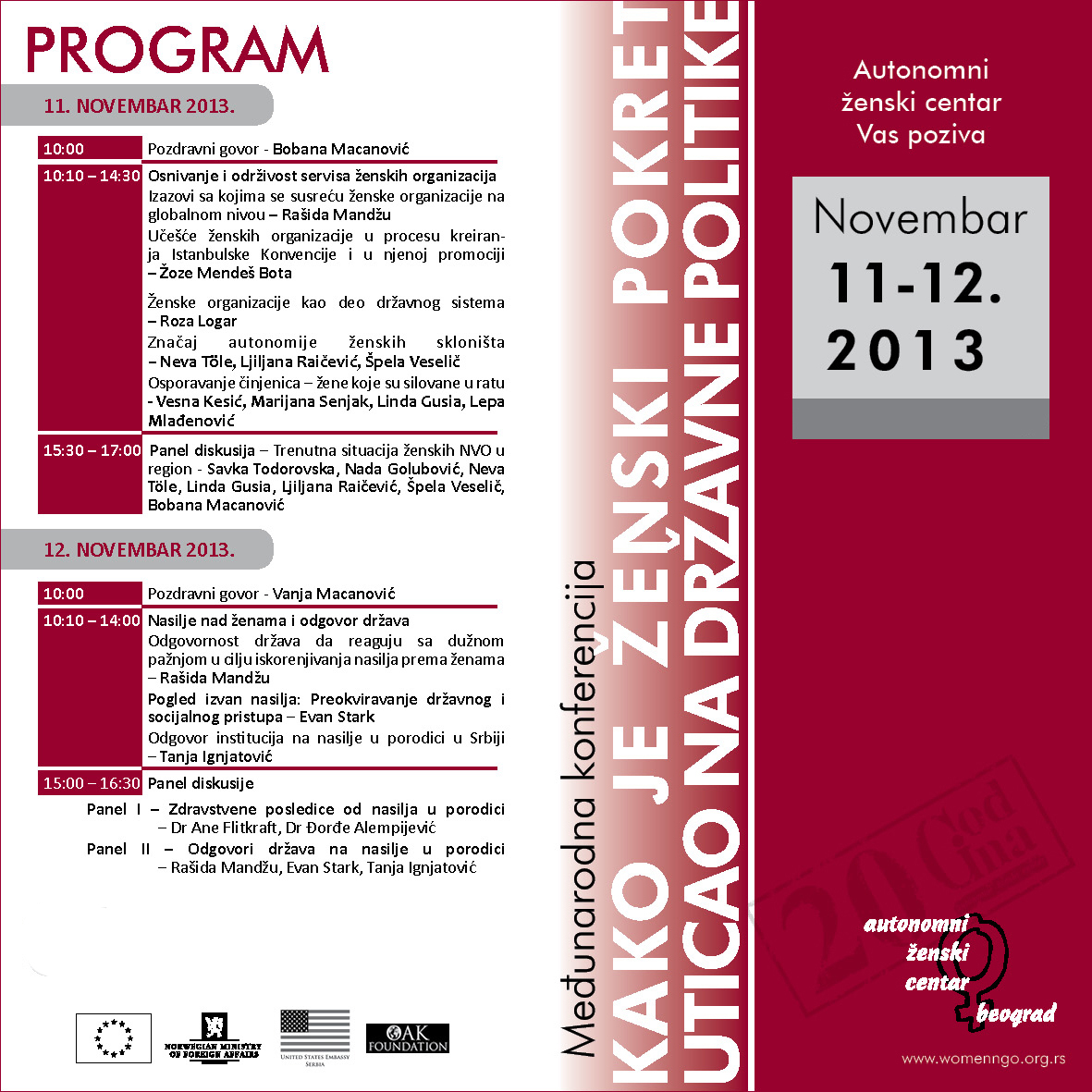 07/11/2014, Beograd Međunarodna konferencija: Primena Konvencije Saveta Evrope protiv nasilja prema ženama - godinu dana od njenog potvrđivanja u Republici Srbiji |