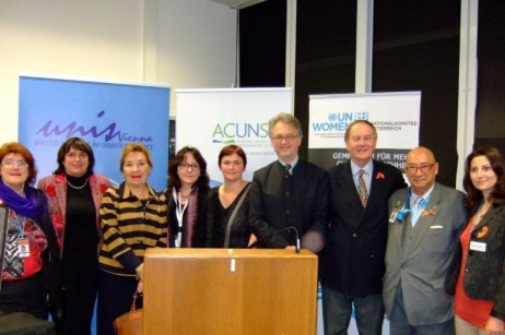 | Member of the Autonomous Women’s Center Vanja Macanović presented at the Symposium of the Academic Council on the United Nations System (ACUNS) in Vienna the regional campaign ‘’I sign’’, which is also been conducted at the territory of the Republic of Austria. Representatives of the UN and permanent Ambassadors at UN, members of the UN Committee for the elimination of all forms of violence against women (CEDAW) Ms. Dubravka Šimonović and Ms. Feride Acar participated at the Symposium, together with members of the Austrian Parliament Ms. Gisela Wurm and Ms. Alev Korun, representatives of the Council of Europe and UN Women, and representatives of women NGO’s from Austria. During the Symposium participants had been signing the Statement of campaign support. More on Symposium you can find on: SYMPOSIUM |