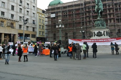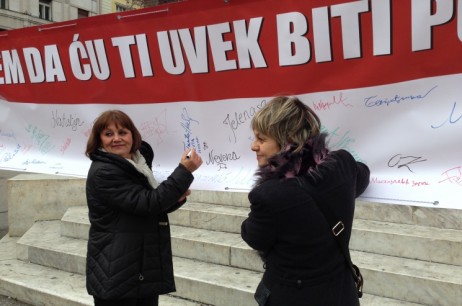 | Women's organizations from Belgrade: Autonomous Women's Center, ASTRA, Atina, Daje i ...Out of Circle, with support of Network Women against Violence, activists of women's organizations from Serbia and members of civil society organizations, as well as a great number of citizens, participated in the action of distributing informative material and signing to support all women who have experienced violence, with slogan I SIGN THAT I WILL ALWAYS SUPPORT YOU. These organizations, specialized for support of women who have experienced intimate partner violence, domestic violence, human trafficking, as well as dealing with women with disabilities and Roma women who have experienced violence, advocated the establishment of a free of charge |